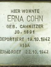 Aus den Deportationslisten sind ihre letzten Lebenstage abzulesen: Im Oktober 1942 musste sie sich im Sammellager an der Levetzowstraße 7-8, einer nicht vollkommen zerstörten Synagoge, zur Deportation registrieren lassen. Von dort musste sie am 19. Oktober mit wenig Handgepäck in einer von bewaffneten Polizisten begleiteten Kolonne durch das Stadtgebiet – unter den Augen der dort wohnenden Berliner – zum Bahnhof Grunewald marschieren und wurde in einen am Gleis 17 bereitstehenden Zug getrieben, der verriegelt und verplombt nach Riga geleitet wurde. Gleich nach der Ankunft am 22. Oktober 1942 wurden fast alle der 944 Insassen erschossen, vermutlich war Erna Cohn darunter.