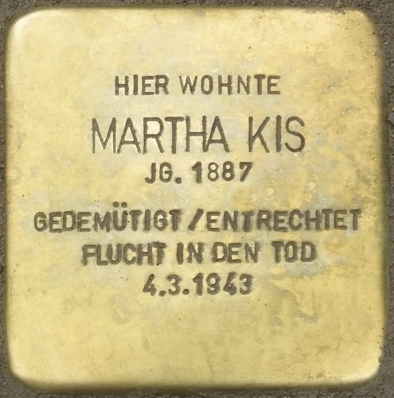 Martha Kis wurde am 19. Oktober 1887 in Hamburg geboren. Ihre Staatsbürgerschaft war im Melderegister mit „Ungarisch“ angegeben. Im Adressbuch stand sie nicht. Welchen Beruf sie ausübte, ist nicht herauszufinden. Martha Kis entzog sich am 4. März 1943, ein gutes halbes Jahr nach dem Abtransport des im selben Haus wohnenden Ehepaars Neubaur und mancher Bekannter aus der Nachbarschaft, der bevorstehenden