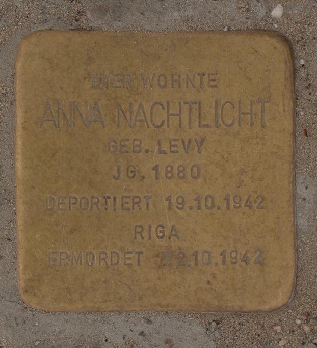 Am 22. September 1942 starb Leo Nachtlicht im Jüdischen Krankenhaus. Anna Nachtlicht verließ am 19. Oktober 1942 mit dem „21. Osttransport“ vom Moabiter Bahnhof Putlitzbrücke Berlin Richtung Riga. Unter den 959 Berliner Jüdinnen und Juden dieses Transportes waren 140 Kinder unter zehn Jahren. In Riga wurden 81 Männer zum Arbeitseinsatz ausgewählt, nur 17 von ihnen überlebten. Alle anderen Menschen wurden nach der Ankunft in umliegende Wälder gebracht und dort ermordet.