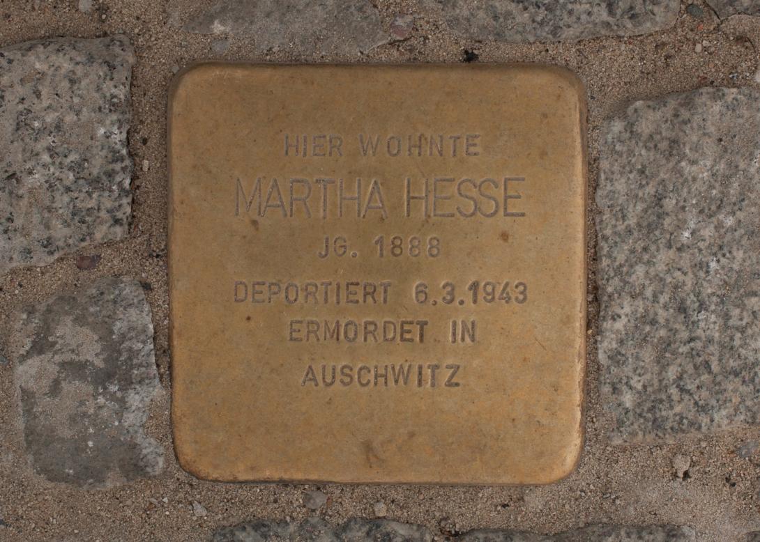 Im Gedenkbuch Juden in Charlottenburg erzählt Ingrid Mattheußer-Schönberg aus ihrer Kindheit in der Nazizeit, dass ihr jüdischer Vater, der Anwalt Curt Schönberg, Anfang der 1940er Jahre von Antisemiten attackiert worden ist und zeitweilig im Rollstuhl saß: Eine Krankenschwester kam ins Haus. Schwester Martha Hesse. Ich verstand nicht, weshalb meine Mutter ihr verbot, auch nur einen Schritt aus unserer Wohnung zu tun. Dass Schwester Martha bei uns war, durfte ich niemandem erzählen. Eines Tages ging sie aus dem Haus, um Lebensmittelkarten zu holen. Irgendwie erfuhr Mama davon und ging ihr nach, Sie durfte ihr noch eine warme Decke und ein paar Sachen bringen, ich glaube in die Große Hamburger Straße. Ich habe Schwester Martha nie wiedergesehen.