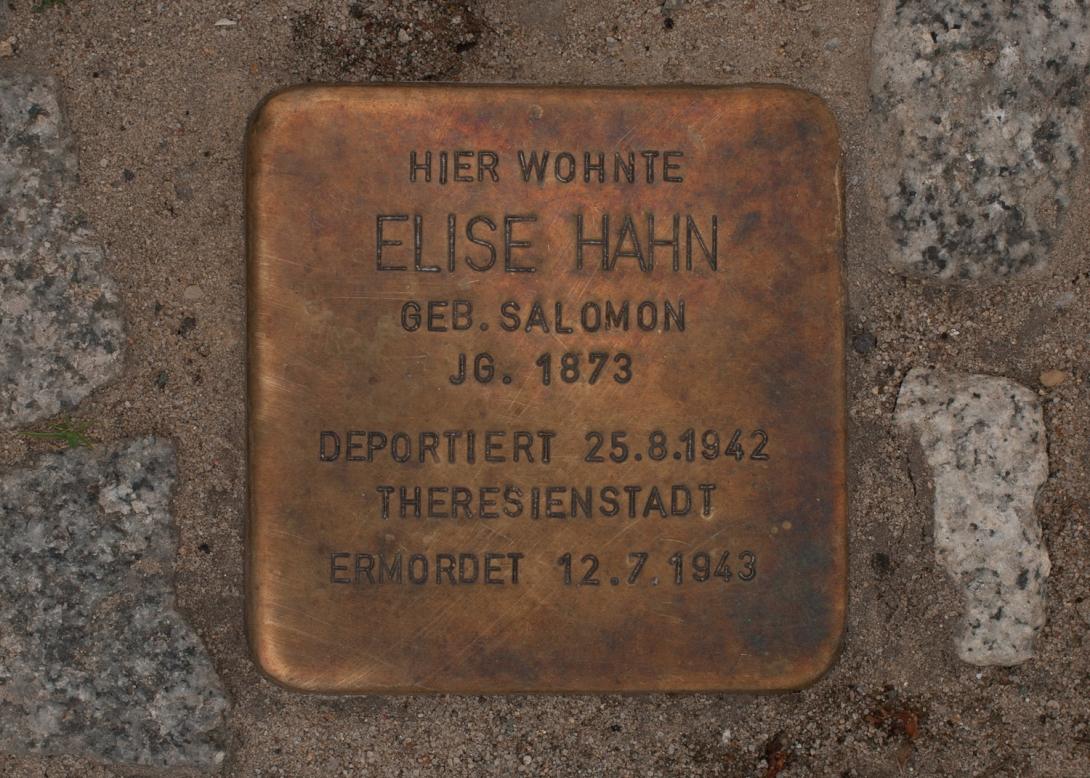 Elise Hahn wurde am 25. August 1942 mit dem sog. „49. Alterstransport“ mit 99 weiteren Menschen nach Theresienstadt deportiert und dort am 12.7.1943 ermordet