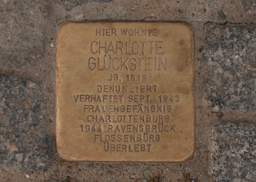 Charlotte Glückstein wurde auf eine Odyssee getrieben, die anderthalb Jahre dauerte. Deren erste Station war das Frauengefängnis Charlottenburg in der Kantstraße, gefolgt vom Straflager 21 in Hallendorf, dem KZ Ravensbrück und zwei Außenlagern des KZ Flossenbürg . Sie floh Ende April 1945 aus dem Lager Neu-Rohlau, Sudetengau, zu Fuß in die bereits amerikanisch besetzte Zone im Vogtland. Die Flucht dauerte sieben Tage. Noch dreihundert Kilometer bis Berlin. Noch zwei Wochen bis zu Charlottes 26. Geburtstag. Sie wog 40 Kilo.