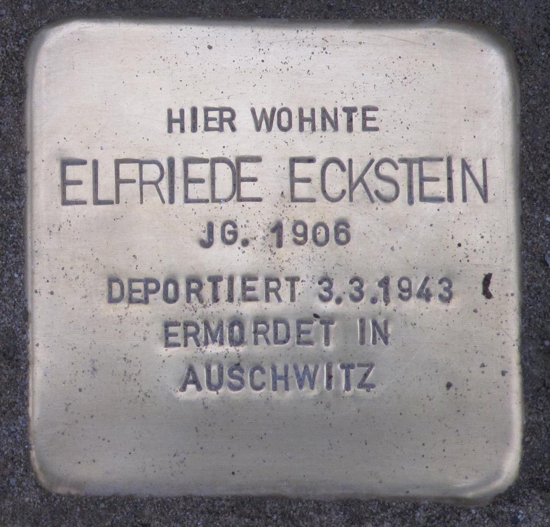 Elfriede Eckstein wurde am 3. März 1943 mit dem 33. Osttransport, zusammen mit 1726 Menschen, nach Auschwitz deportiert und dort ermordet.