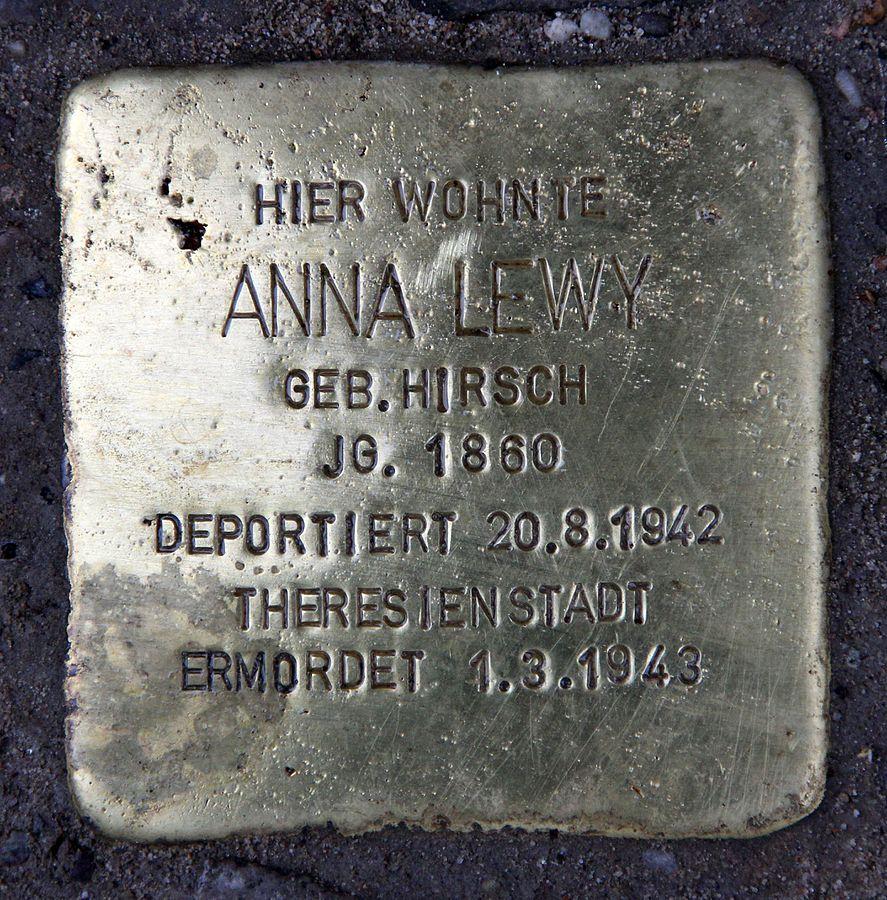 Anna Lewy geb. Hirsch ist am 16. August 1860 in Dobsch (Dobrcz) bei Bromberg geboren. Deportiert wurde sie am 20. August 1942 vom Anhalter Bahnhof nach