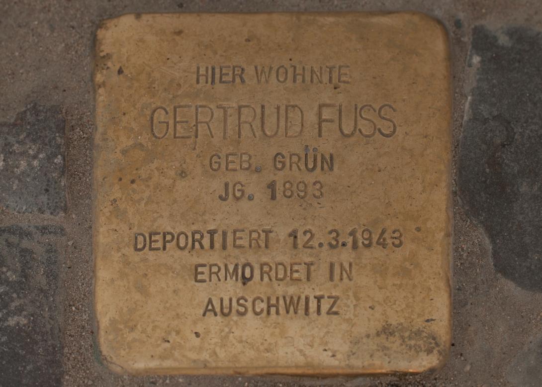 Gertrud Fuss, geb. Grün, wurde geboren am 18. April 1893 in Posen (Poznan) und war mit Max Fuss, geboren am 31. März 1879 in Schrimm (Srem) in der Region Posen (Poznan), verheiratet. Sie lebten bis zu ihrer Verhaftung durch die Geheime Staatspolizei (