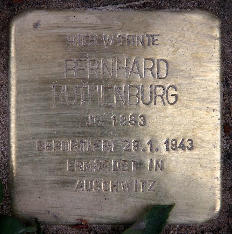 Bernhard Ruthenburg, seine Frau Marie und deren Bruder Adolf Deiler, der bei ihnen wohnte, mussten sich im Januar 1943 in der Sammelstelle in der Großen Hamburger Straße, einem ehemaligen jüdischen Altersheim, melden und wurden zur Deportation eingeteilt. Den Bescheid, dass ihr Vermögen „zugunsten des Deutschen Reiches eingezogen“ worden sei, erhielten sie am 27.1.1943. Am 29. Januar 1943 sind sie vom Bahnhof Grunewald in einem Zug der Reichsbahn mit 1 000 Menschen nach Auschwitz gefahren und dort ermordet worden.