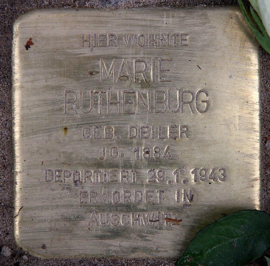Marie Ruthenburg, geb. Deiler, wurde am 17. September 1884 in Frankfurt am Main geboren. Sie war die Schwester von Adolf Deiler, der bei ihr in der Westfälischen Straße 42 in einer geräumigen Wohnung im zweiten Stock rechts zur Untermiete wohnte. Adolf Deiler hatte den Plan, mit seinem Schwager Bernhard Ruthenburg und seiner Schwester Marie nach Schweden auszuwandern. Wie und wann das verhindert wurde, ist nicht bekannt.