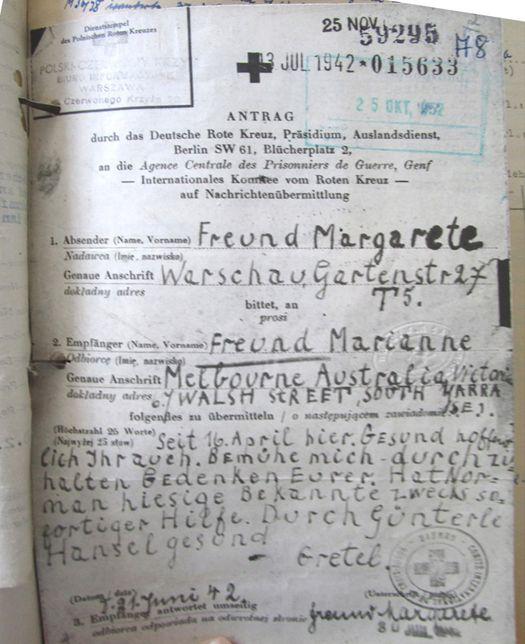 Die letzte Nachricht ihrer Mutter, die Marianne Freund in Melbourne erhielt, war auf den 21. Juni 1942 datiert - ein paar knappe Zeilen in einem Rotkreuz-Brief (höchstens 25 Worte waren erlaubt): „Seit 16. April hier. Gesund hoffentlich Ihr auch. Bemühe mich – durchzuhalten. Gedenke Eurer. [...] Gretel“. Margaretes weiteres Schicksal ist nicht dokumentiert. Ab Juli 1942 wurden die Ghettobewohner weiter in Vernichtungslager deportiert, vor allem nach Treblinka. Falls Margarete Freund tatsächlich durchhalten konnte und nicht an den menschenunwürdigen Lebensbedingungen umkam, ist es sehr wahrscheinlich, dass auch sie in Treblinka ermordet wurde. Ein weiteres Lebenszeichen von ihr bekamen ihre Kinder nicht mehr.