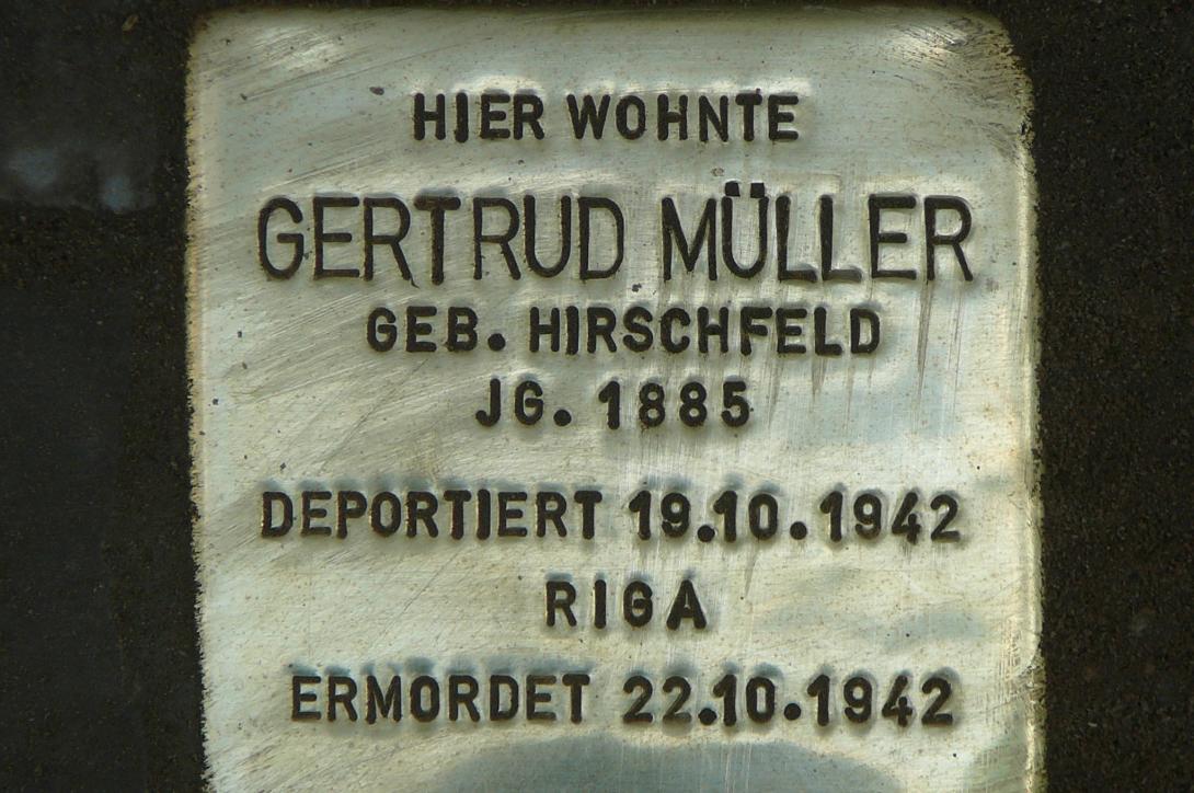 Gertrud Müller wurde am 17. Juni 1885 in Breslau als Gertrud Hirschfeld geboren. Da um diese Zeit mehrere Familien Hirschfeld in Breslau wohnten, können wir nicht wissen, wer genau ihre Eltern waren. Auch über ihr weiteres Leben haben wir leider nur sehr spärliche Informationen. So wissen wir nicht, wann sie nach Berlin kam, ob mit ihrer Familie oder allein oder verheiratet. Wir wissen auch nichts über den Herrn Müller, den sie heiratete. Belegbar ist nur, dass sie 1934, als sie eine Wohnung in der Wielandstraße 31 mietete, verwitwet war.