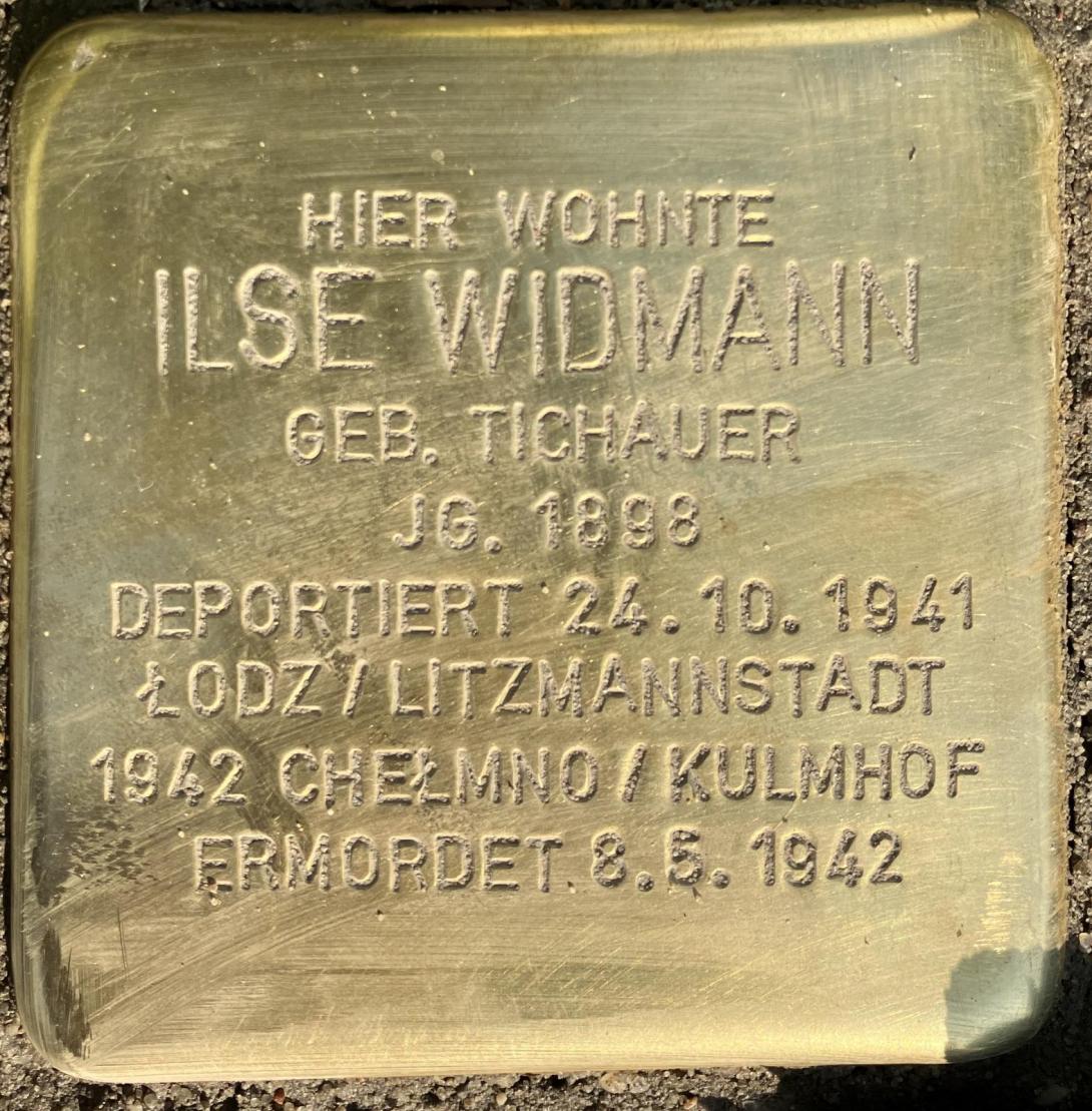 Ilse Widmann wurde am 18. Februar 1896 in Liegnitz, im heutigen Polen, damals Niederschlesien, geboren. Von dort wurde sie 1939 vermutlich vertrieben und zog nach Berlin. Ihre Schwester, Ruth, wurde 1901 geboren und lebte in Berlin als verheiratete Dr. Ruth Edelmann. Elise Wegner war vermutlich eine Verwandte von ihr, denn beide sind geborene Tichauer. Ilse heiratete Hermann Widmann, der 1939 verstorben ist. Sie lebte mit ihrem Kind Gabriele in der Fritschestraße 19 bei ihrer Großmuter Cäcilie Tichauer, geb. Puck.