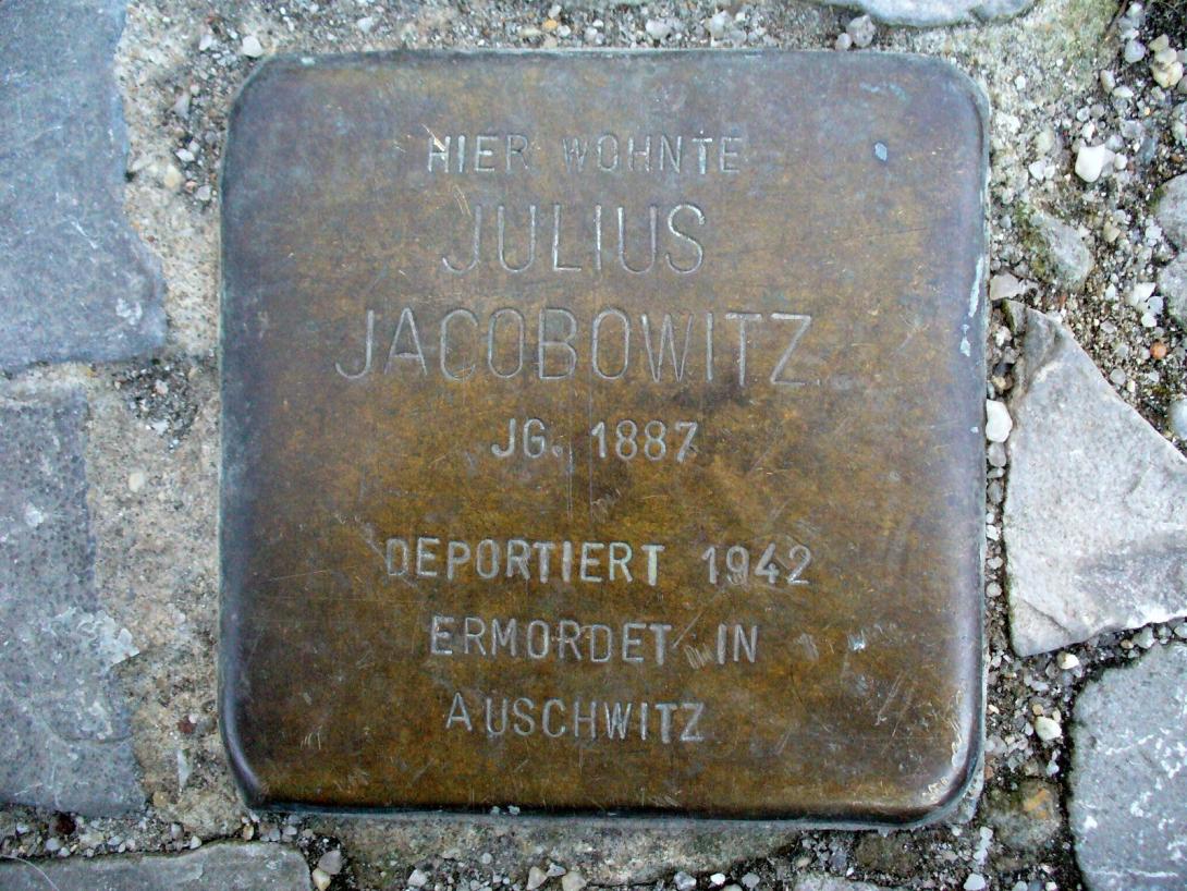 Julius Jacobowitz, ist am 2. April 1887 in Berlin geboren. Seine Staaatsangehörigkeit wurde 1939 mit „DR“, das hieß: Deutsches Reich, angegeben. Im Adressbuch 1939 war er als einziger dieser vier mit dem Zusatz „Innenarchitekt“ eingetragen. Da sich die anderen drei dieses Nachnamens nicht öffentlich registrieren ließen, ist über ihre Berufe nichts zu erfahren.