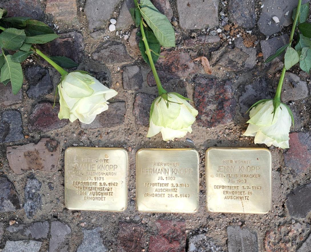 In der Winsstraße in Prenzlauer Berg liegen schon viele Stolpersteine. Seit dem 2. Juni 2020 liegen dort fünf Stolpersteine mehr, vor dem Haus mit der Nr. 9. Die Steine erinnern an die Familie Oschitzki: an Mutter Tona Oschitzki (geborene Bukofzer), Vater Leo Oschitzki* und ihre drei Kinder Alfred, Marion Franziska und Judith Paula.