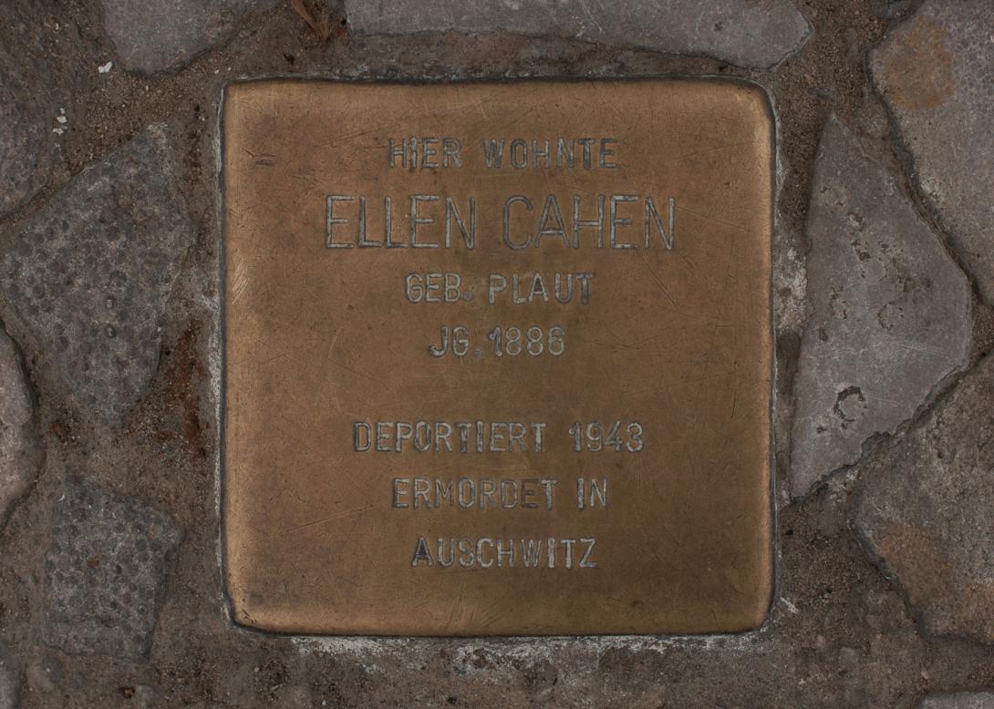 Ellen Cahen geb. Plaut, geboren am 27. Mai 1886 in Berlin, wohnte in der Xantener Straße 20. Zeitweise, jedenfalls bei der Volkszählung am 17. Mai 1939, war sie auch in der Wohnung ihrer Mutter Ernestine Plaut und ihrer Schwester Hanna Plaut in der Pariser Straße 18 registriert, nach einer Zusatzbemerkung der Polizei war sie „gemeldet als Ellen Plaut“, also mit ihrem Mädchennamen.