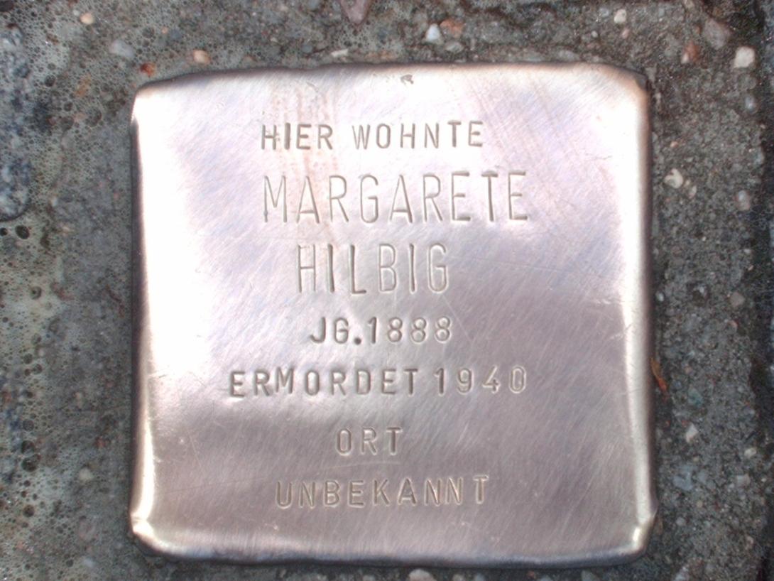 Im Februar 1934 empfahl die Heilanstalt Wittenau bei einer Meldung an das Hauptgesundheitsamt und den Kreisarzt, die zu diesem Zeitpunkt 45-jährige Margarete Hilbig aufgrund erneut diagnostizierter „Schizophrenie“ zu sterilisieren: „Eine Sterilisation ist wünschenswert.“ Wegen ihres Alters wurde der Eingriff bei der als „erbkrank“ eingeordneten Patientin nicht durchgeführt. Am 27. Juli 1936 wurde Margarete Hilbig von Wittenau nach Wuhlgarten verlegt. Dort hieß anschließend an die Einschätzung der Heil- und Pflegeanstalt Wittenau: „Fräulein Hilbig leidet an einer mit Wahnideen u. Sinnestäuschungen einhergehenden Geisteskrankheit“. Mutter und Tochter standen während der gesamten Zeit der Aufenthalte von Margarete in den Heilanstalten in engem Kontakt. Als die Mutter 1940 – inzwischen war sie in die Annenstraße 1 in Berlin-Mitte umgezogen – feststellte, dass es ihrer Tochter deutlich besser ging, und die Klinik daraufhin bat, Margarete nach Hause zu entlassen, lehnte die Klinik dies jedoch am 13. Juni 1940 rigoros ab. Kurz danach, am 17. Juni 1940, vermerkt der Arzt Dr. Lehmann für die Heilanstalt Wuhlgarten in der Krankenakte von Margarete Hilbig: „Mit Sammeltransport in eine andere Anstalt verlegt“. Margarete Hilbig wurde 1940 an einem unbekannten Ort ein Opfer der „Euthanasie“-Morde.