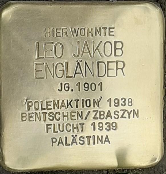 Leo Jakob Arjeh Engländer wurde am 26.12.1901 in Berlin geboren. In Berlin war er ledig und lebte zusammen mit seinen Eltern Isidor und Malwina sowie dem jüngeren Bruder Heinz. Leo besuchte die 290. Gemeindeschule in der Danziger Straße bis zu seinem 6. Lebensjahr, später die Königsstädtische Oberrealschule in der Pasteurstraße, die er mit dem Reifezeugnis für die Obersekunda abschloss. Anschließend ging er in die Lehre bei der Firma Grünthal, Sorensohn & Co, ein Damenbekleidungsgeschäft. Hier war er danach bis 1923 eingestellt.