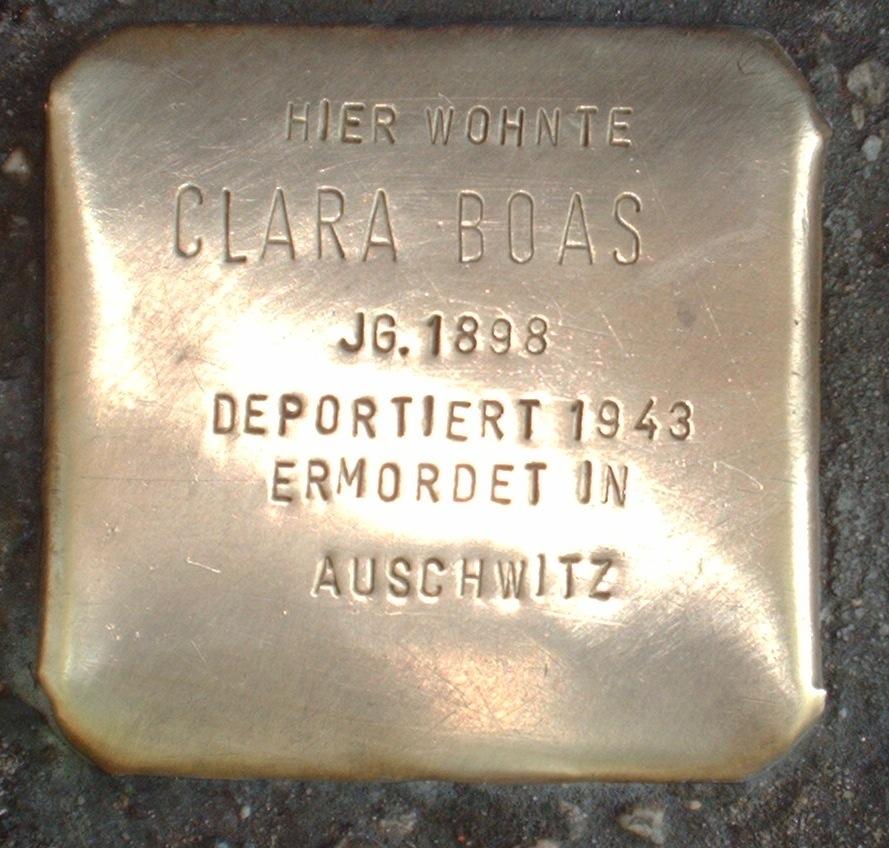 Helene und Clara Boas wurden am 1. März 1943 nach Auschwitz deportiert und gelten seitdem offiziell als „verschollen“. Ihre Schwester Hertha folgte ihnen zwei Tage später, am 3. März 1943, auf den Weg in den Tod.