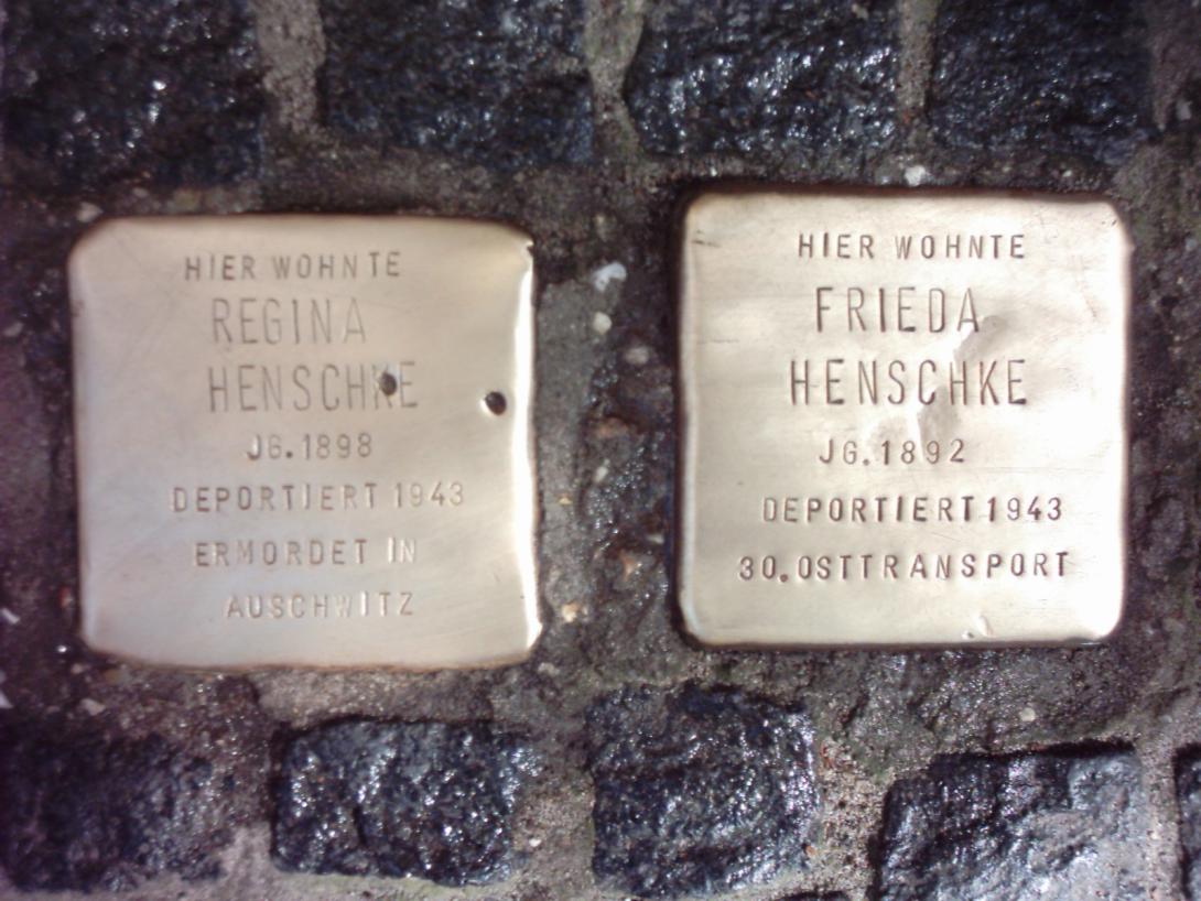 Beide Schwestern mussten während des Nationalsozialismus Zwangsarbeit leisten. Frieda war in der Wäscherei Gubeler und Krause im Bezirk Lichtenberg beschäftigt und Regina musste für Ehrich & Graetz in Treptow arbeiten. Das Unternehmen Ehrich & Graetz produzierte während der Weltkriege Waffen und Munition und ist für seine skrupellose Ausbeutung von Juden und anderen Zwangsarbeitern bekannt. Frieda und Regina Henschke mussten am 23. Februar 1943 in einer Vermögenserklärung Auskunft über ihren Besitz erteilen. Sie gaben an, einige Aktien zu besitzen und über ein Guthaben bei dem Bankgeschäft Lenz und Co. in München mit einem Gesamtwert von circa 10 000 Reichsmark zu verfügen. Schon am darauffolgenden Tag, also am 24. Februar, wurde damit begonnen, ihr Vermögen schrittweise einzuziehen. Dabei wurde zuerst ihr Guthaben beim Bankgeschäft Lenz und Co. beschlagnahmt. Es muss den Schwestern bewusst gewesen sein, dass der Zeitpunkt ihrer Deportation nun nicht mehr lange auf sich warten lassen würde. Einige Monate zuvor hatten sie dieselben Maßnahmen schon bei ihrer Mutter erlebt, die am 8. September 1942 nach Theresienstadt deportiert wurde, wo sie am 1. April 1943 starb. Am 26. Februar 1943 wurden Frieda und Regina Henschke mit dem 30. Osttransport nach Auschwitz deportiert und ermordet.