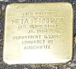 Während Metas Mutter noch vor Kriegsbeginn zu ihrer Tochter Else nach Südafrika emigrieren konnte, wurde Meta Bernhard mit ihrer 7-jährigen Tochter Ruth am 6. März 1943 im „35. Osttransport“ nach Auschwitz deportiert. Ihr Mann Willy war bereits zwei Tage zuvor mit dem „34. Osttransport“ dorthin abtransportiert worden.