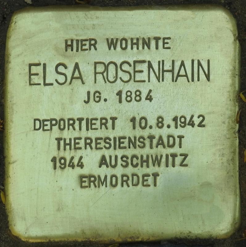 Am 23. Oktober 1944 wurde Elsa Rosenhain von Theresienstadt in das Vernichtungslager Auschwitz Birkenau deportiert, wo sie im Alter von 60 Jahren ermordet wurde.