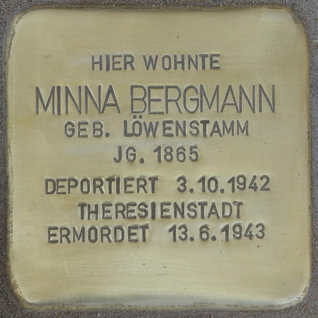 Zuletzt wohnte Minna Bergmann mit ihrer Tochter Marie am Kaiserplatz 1. Sie musste noch miterleben, dass ihre Tochter am 26. Oktober deportiert wurde, wenige Tage später, am 3. Oktober 1942, wurde sie selbst nach Theresienstadt verschleppt. Dort starb sie am 13. Juni 1943. In der Todesanzeige wird als Krankheit „Darmkatarrh“ und als Todesursache „Herzlähmung“ angegeben. Es ist historisch bekannt, dass Todesursachen häufig nicht korrekt benannt wurden, um zu verschleiern, dass viele Menschen in Theresienstadt an Hunger, mangelnder medizinischer Versorgung und den unsäglichen, lebensfeindlichen Bedingungen starben.