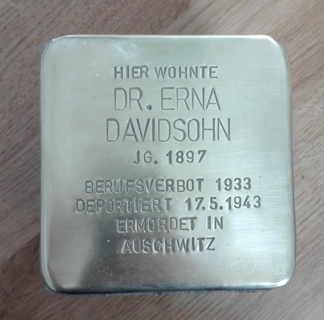 Erna ging auf die erste höhere Töchterschule, die Chamisso-Schule nahe dem Barbarossaplatz und machte 1918 ihr Abitur an der Königlichen Augusta Schule, der Vorgängerin der heutigen Sophie-Scholl-Schule. Sie studierte Medizin in Freiburg und Berlin, schloss im Jahr 1924 ihre Doktorarbeit erfolgreich ab. SIe arbeitete dann zunächst in der Praxis ihres Vaters und eröffnete dann eine eigene Praxis in der Tempelhofer Manteuffelstraße 21. Lange konnte sie diese Praxis aber nicht halten, da sie und ihr Vater wie viele andere jüdische Berliner_innen 1938 durch die Nationalsozialisten mit einem Berufsverbot belegt wurden. Die Familie Davidsohn wurde 1939 gezwungen, ihre Wohnung in der Crellestraße zu verlassen und zog zwangsweise in beengte Verhätnisse in die Marburger Str. 5.
