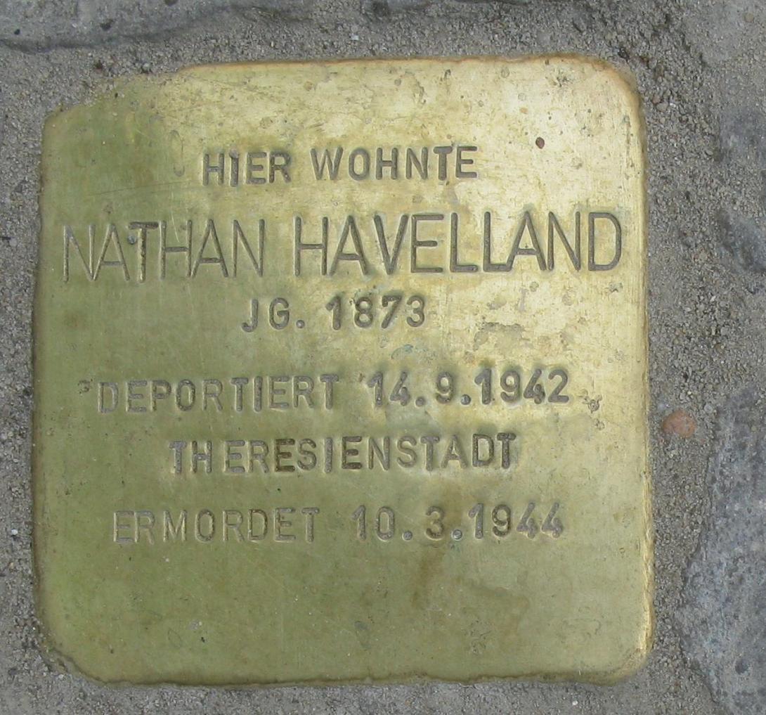 Am 14. September 1942 ist Nathan Havelland in einem Zug mit 1000 Menschen vom Güterbahnhof Moabit nach Theresienstadt gebracht worden. Auf der Deportationsliste stand er unter der Nummer 499, in der Spalte Beruf war „ohne“ eingetragen. Im Ghetto Theresienstadt wurde der 71-jährige am 10. März 1944 ums Leben gebracht.