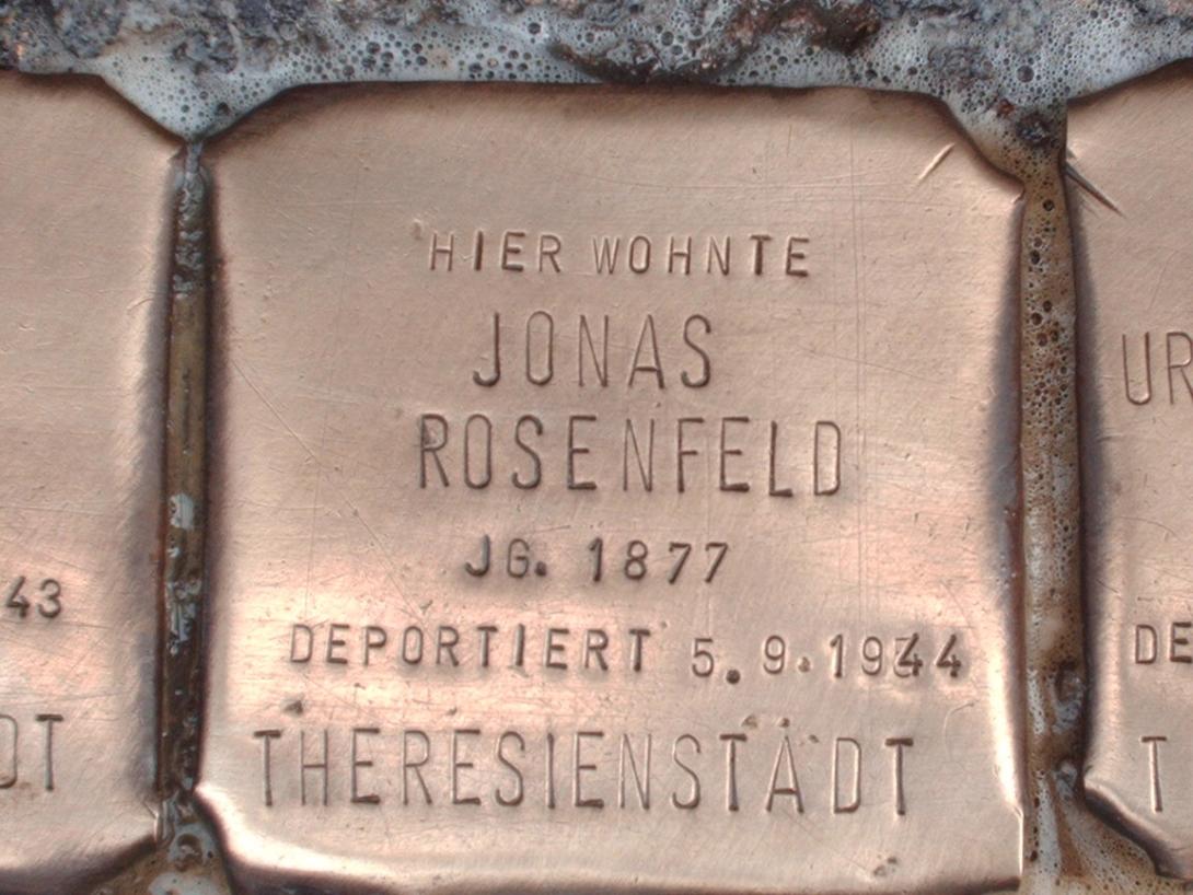 Am 18. August 1944 starb Jonas Rosenfelds Frau Frieda in der Dresdnerstraße 15 in Kreuzberg, wo das Ehepaar seit dem 1. Dezember 1943 als Untermieter der Familie Dobrin lebte. Damit verlor ihr Mann den Schutz vor der Deportation , den seine Ehe mit einer „Arierin“ ihm bis dahin geboten hatte. Vom 21. August 1944 bis zum 8. September 1944 war er in der Sammelstelle in der Schulstraße 78 in Berlin-Wedding inhaftiert. In der Sammelstelle füllte Jonas Rosenfeld am 22. August 1944 seine Vermögenserklärung aus, die formale Voraussetzung für die Einziehung seines Vermögens. Am 5. September 1944 wurde er mit dem „110. Theresienstadt-Transport“ deportiert. Im gleichen Transport befand sich auch seine Tochter Ursula mit ihrem Sohn Uri.