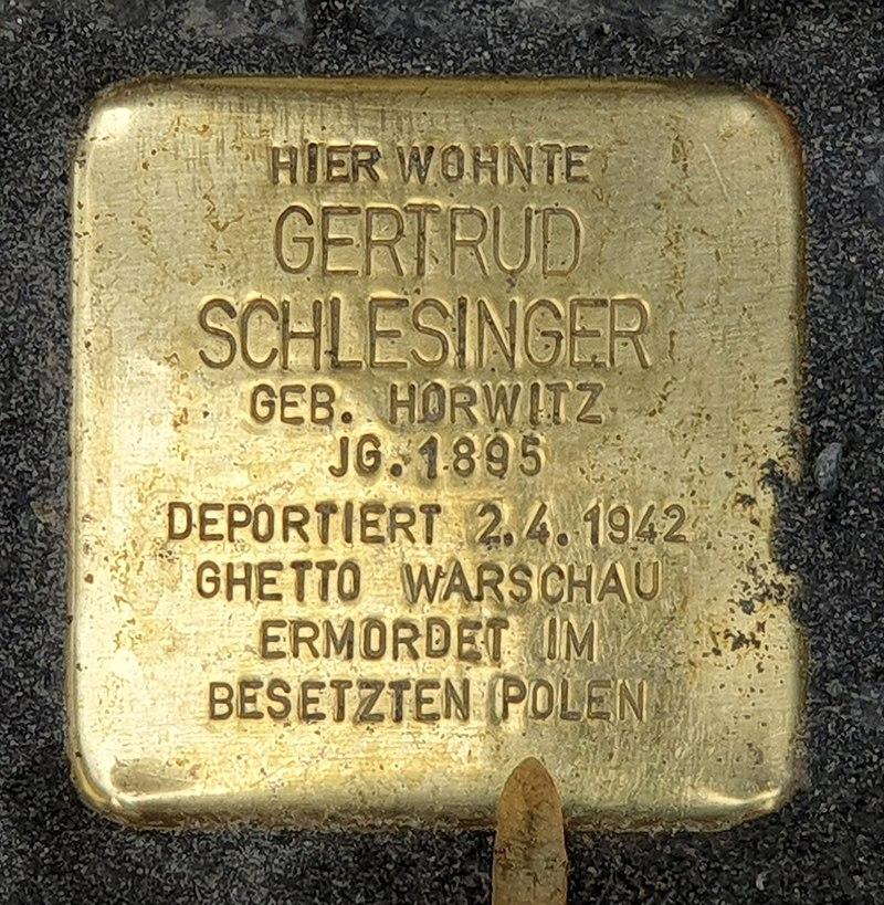 Gertrud Schlesinger kam am 18. Juni 1895 im Landkreis Jauer in Niederschlesien, dem heutigen Jawor in Polen, zur Welt. Im Geburtsregister in Jauer wurden als Eltern eingetragen der Kaufmann Bernhard Horwitz und seine Frau Regina, geb. Fuhrmann, die am 25. Juli 1894 in Oppeln geheiratet hatten.