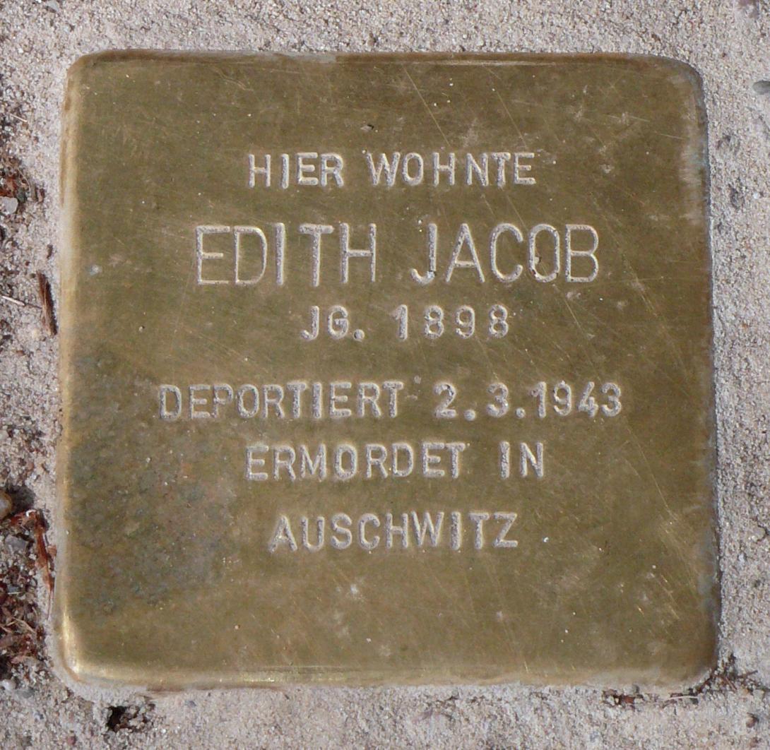 Edith war unverheiratet und kinderlos und lebte mit einem Lebensgefährten zusammen, von dem sie finanziell unabhängig war. Seit 1937 war sie Mitglied des Ensembles des jüdischen Kulturbund-Chores. Sie begleitete ihre Schwester nach Hamburg, die sich dort mit ihrem Sohn am 20.1.1939 auf der Monte Rosa einschiffte, um nach Sao Paulo auszuwandern. Edith wollte später mit ihrer Mutter nachkommen. Sie erlitt jedoch beim Anblick der Auswanderer und der umherschwirrenden Gerüchte einen schweren Nervenzusammenbruch – es war auch die Trennung vom Lebensgefährten vorausgegangen – und sie musste klinisch behandelt werden. Ihrer Mutter gelang es unter großen Schwierigkeiten, sie aus der Anstalt herauszuholen, aus Angst, dass sie sonst der Euthanasie zum Opfer gefallen wäre. Sie wurde dann zur Zwangsarbeit in der Wäscherei Spindler eingesetzt.