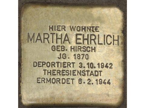 Martha Ehrlich musste sich gemeinsam mit ihrer Tochter Margarete Arendt im von den Nationalsozialisten als „Sammellager" missbrauchten Ersten Altenheim der Jüdischen Gemeinde zu Berlin in der Großen Hamburger Straße 26 einfinden. Am 3. Oktober 1942 wurde sie mit dem sogenannten „3. Großen Alterstransport" mit über 1000 jüdischen Berlinerinnen und Berlinern in das Ghetto Theresienstadt deportiert. Das Gedenkbuch des Bundesarchivs gibt als Todesdatum den 6. Februar.1944 an: „für tot erklärt". Dokumente dazu gibt es in der Opferdatenbank Theresienstadt nicht.