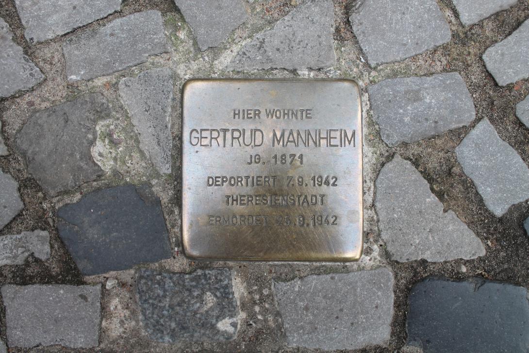 Am 7. September 1942 wurde sie im Alter von 71 Jahren zusammen mit vier weiteren Frauen aus der Winsstraße 14 zunächst ins Sammellager an der Großen Hamburger Straße 26 und dann ins Ghetto Theresienstadt deportiert. Ebenfalls erlitt dieses Schicksal die ihr vermutlich bekannte Magdalene Sternfeld, die um die Ecke in der der Droysenstraße 19 wohnte. Keine zwei Wochen später, am 25. September 1942, starb Gertrud Mannheim an Darmkatarrh, eine Folge von Unterernährung, schlechten hygienischen Verhältnissen und fehlender medizinischer Versorgung. Ihr Totenschein ist in der Opferdatei Theresienstadt erhalten: http://www2.holocaust.cz/de/victims...