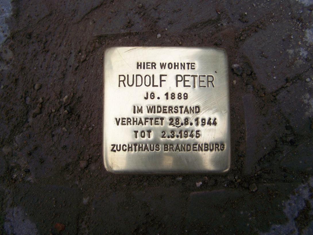 Rudolf Peter gehörte zum Arbeiterwiderstand und wirkte 1943/44 in der Saefkow-Jacob-Bästlein-Gruppe mit. Rudolf Peter wurde in Podersam bei Saaz geboren, war Buchbinder von Beruf und gewerkschaftlich organisiert. Er lebte seit 1944 in Berlin und arbeitete als Buchbinder beim Deutschen Verlag. Dort erhielt er Kontakt zur illegalen Gewerkschaftsgruppe und beteiligte sich an der Verteilung illegaler Schriften und Flugblätter. Er bemühte sich um Kontakte zu ehemaligen sozialdemokratischen Funktionären. Rudolf Peter wird am 28.08.1944 verhaftet und am 18.01.1945 vom Volksgerichtshof zu vier Jahren Zuchthaus und Ehrverlust verurteilt. Zur Strafverbüßung wird er am 02.02.1945 ins Zuchthaus Brandenburg-Görden gebracht, wo er am 02.03.1945 ums Leben kommt.