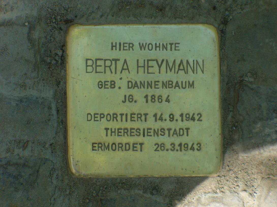 Am 14. September 1942 wurde Berta Heymann nach Theresienstadt deportiert, wo sie am 26.3.1943 ums Leben gebracht wurde. Die bei ihr wohnenden Eltern ihres Schwiegersohnes sind vermutlich gleichzeitig deportiert worden. Bertas Tochter Erna, deren Ehemann Rudolf Neugass und der gemeinsame Sohn Harry Leopold wurden unter der deutschen Besatzung in Drancy bei Paris interniert und von dort am 7.9.1942 nach Auschwitz deportiert und ermordet. Ein weiteres Kind, die 1928 geborene Ruth-Evelyn Neugass, entgeht der Deportation . Arthur Heymann kam ebenfalls nach Drancy und von dort am 4.9.1942 erst nach Auschwitz und dann vermutlich nach Dachau. Ein Überlebender berichtete, er sei dort Ende 1943 gestorben. Er wurde 1945 für tot erklärt.