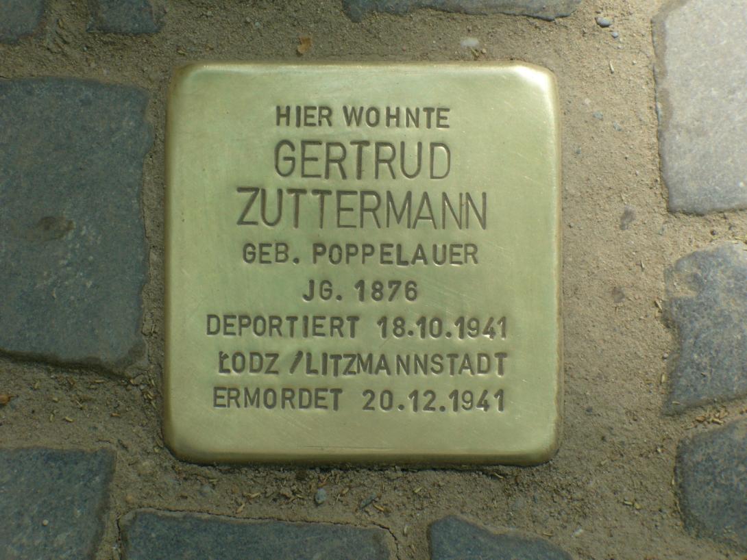 Gertrud Zuttrermann war am 20. März 1876 als Tochter des Kaufmannes Carl Jacob Poppelauer und seiner Ehefrau Sara geb. Jacoby in der Oranienstraße 48, Berlin, geboren worden. Ihr Vater war der Inhaber eines Leinen- und Baumwollwarengeschäfts im Parterre ihres Wohnhauses. Dort blieb auch der Laden, als die Eltern wenig später in die Luckauer Straße zogen und 1890 in die Schmidstraße 7. Ob Gertrud Geschwister hatte, wissen wir nicht. Vielleicht war sie mit Moritz Poppelauer verwandt, ein bekannter Buchhändler und Verleger jüdischer Literatur, dessen Buchhandlung in der Neuen Friedrichstraße war. Laut Heiratsurkunde erlernte Gertrud keinen „besonderen Beruf“. Am 4. September 1902 heiratete sie Max Zuttermann und verbrachte mit ihm die Flitterwochen in Bad Homburg, im Hotel Bellevue, wie eine Gästeliste bezeugt.