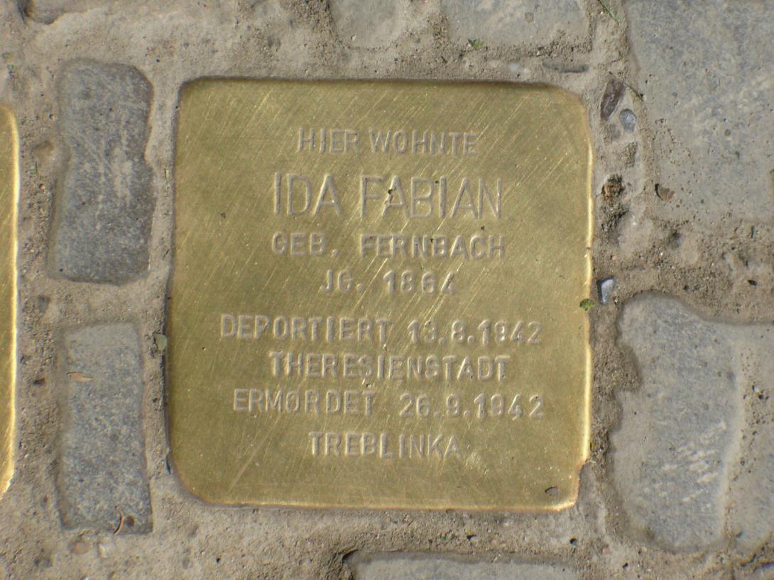 Für ihre eigene Deportation musste Ida 1200 RM „Transportbeitrag“ bezahlen, die an die Jüdische Kultusgemeinde überwiesen wurden. Diese hatte theoretisch für die Verpflegung während des „Transportes“ zu sorgen, konnte aber auch nicht frei über diese Summe verfügen. In Theresienstadt erwartete Ida nicht das von den Nazis behauptete „Altersghetto“, in dem ein ruhiger Lebensabend  zu verbringen sei, sondern ganz im Gegenteil, der reine Horror: überfüllte Unterkünfte, Hunger, Kälte, unbeschreibliche Hygienezustände, Krankheiten, Tod. Für Ida Fabian kam es noch schlimmer: Wenige Wochen nach ihrer Ankunft, am 26. September 1942, wurde sie weiter in das Vernichtungslager Treblinka verbracht und dort ermordet.