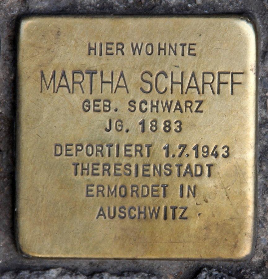Martha Schwarz wurde am 20. März 1883 in Posen in eine jüdische Familie geboren. Am 12. Januar 1911 heiratete sie dort den jüdischen Kaufmann Wilhelm Scharff, der am 11. Dezember 1875 in Nicolai, Kreis Pless, geboren wurde.