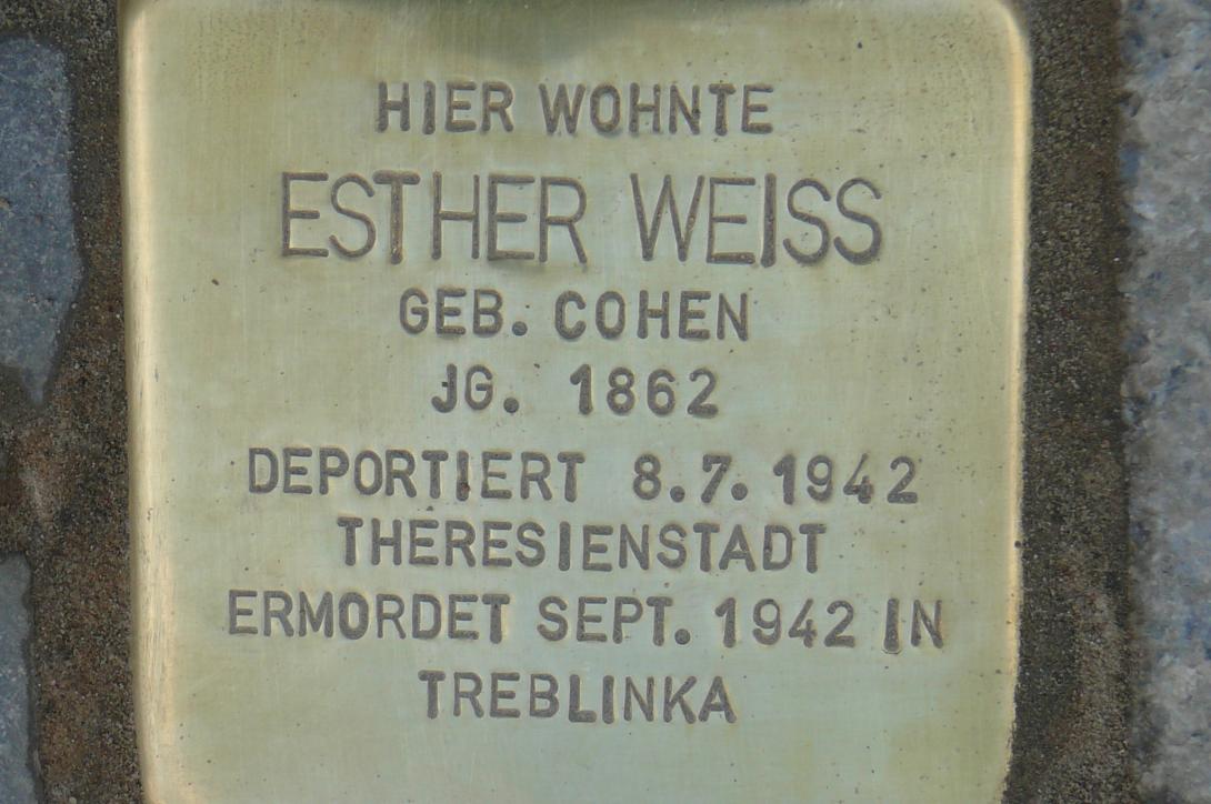 Esther Weiss kam als Esther Elise Cohen am 21. November 1862 in Oldersum (Ostfriesland) zur Welt. Es ist nicht dokumentiert, wann Esther Cohen nach Berlin kam. Vielleicht mit ihren Eltern, vielleicht aber auch bereits als Esther Weiss mit ihrem Ehemann. 1939, als sie als in der Goethestraße 69 erfasst wurde, dürfte sie bereits verwitwet gewesen sein, da nur sie erwähnt war. In den Berliner Adressbüchern tauchen unter dieser Adresse weder ein Herr Weiss noch Esther Weiss auf, woraus zu schließen ist, dass sie zur Untermiete wohnte.