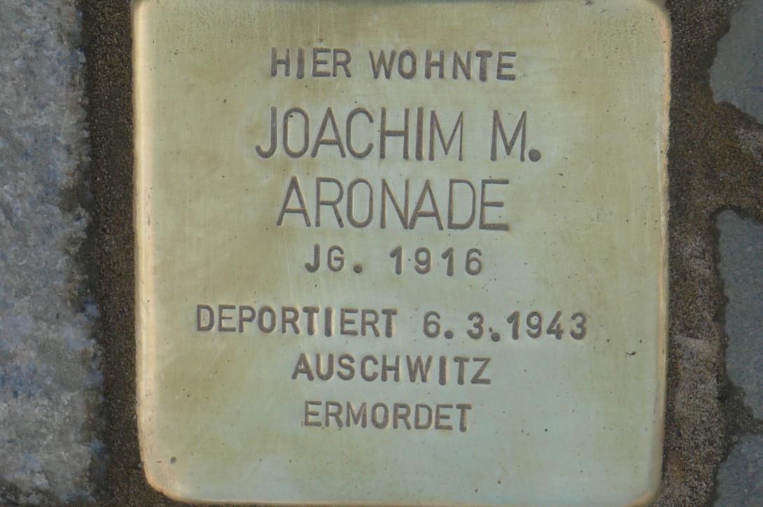 Auch Herbert heiratete - am 24. Mai 1941 - die ein Jahr ältere Liselotte Kalmann aus Beuthen (Schlesien). Joachim und Herbert waren beide seit 1940 zwangsverpflichtet, ab 1941 bei der gleichen Rüstungsfirma in Reinickendorf, Flottenstrasse 8 (H. Gossen, Stahlhoch- und Brückenbau). Max Joachim bekam 0,78 RM die Stunde. Von hier, direkt von der Arbeit, wurde er bei der “ Fabrikaktion ” Ende Februar 1943 oder kurz danach verhaftet und in die zum Sammellager umfunktionierte ehemalige Synagoge in der Levetzowstrasse 7-8 gebracht. Zu diesem Zeitpunkt besaß er nichts als 5 RM Bargeld und an Kleidung “das Nötigste”. Am 6. März 1943 wurde er nach Auschwitz deportiert. Möglich, aber unwahrscheinlich, dass er dort noch einmal seinen Bruder sah. Herbert und Liselotte Aronade waren am 29. Januar 1943 nach Auschwitz deportiert und dort ermordet worden. Ihre Todesdaten sind nicht bekannt. Joachim Max wurde unter unmenschlichen Bedingungen zur Arbeit in Monowitz eingesetzt, dem zu Auschwitz gehörenden Arbeitslager auf dem Gelände der Buna-Werke der IG Farben. Vom 26. November bis 4. Dezember 1943 – und das ist das Letzte, was man von ihm weiß – war er im Häftlingskrankenbau von Monowitz, wurde dann „nach Birkenau entlassen“. Offenbar war der 27-Jährige als nicht mehr arbeitsfähig selektiert und in das Vernichtungslager Auschwitz-Birkenau in den Tod geschickt worden. Das Todesdatum von Max Joachim Aronade ist nicht bekannt.
