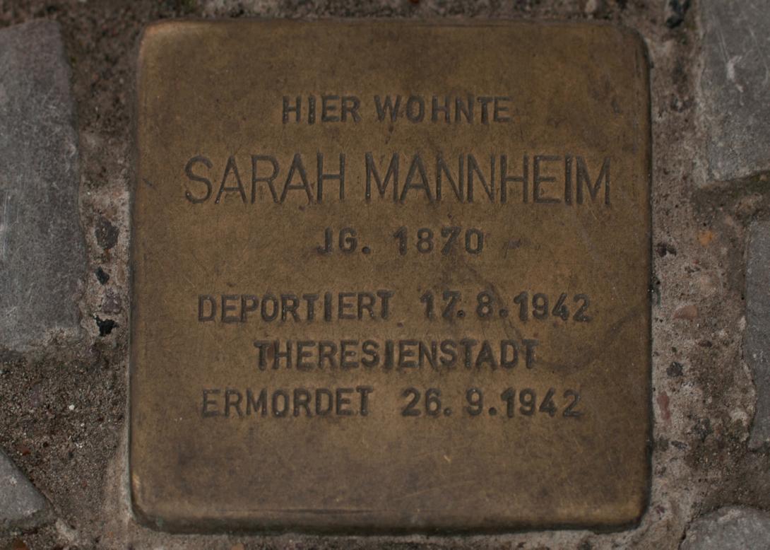 Sarah Mannheim wurde am 22. Dezember 1870 in London geboren. In Berlin wohnte sie in der Grolmannstraße 53, von wo sie am 17. August 1942 nach Theresienstadt deportiert wurde. Dort ist sie nach 40 Tagen am 26. September 1942 ums Leben gebracht worden.