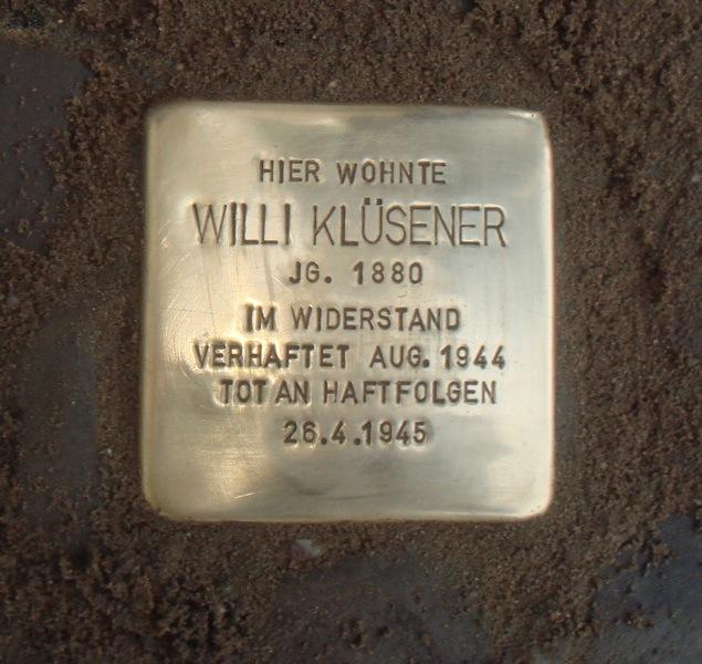 Der am 27. Mai 1880 geborene Bestattungsredner Willi Klüsener gehörte der SPD seit 1909 an und wirkte für die Sozialdemokratie von 1920 bis 1930 als (ehrenamtlicher) unbesoldeter Stadtrat in Berlin-Lichtenberg. Zuletzt Betriebsleiter der Städtischen Straßenreinigung Lichtenbergs, wurde er 1933 aufgrund der NS-Gleichschaltung aus dem Dienst bei der Stadt hinausgeworfen.