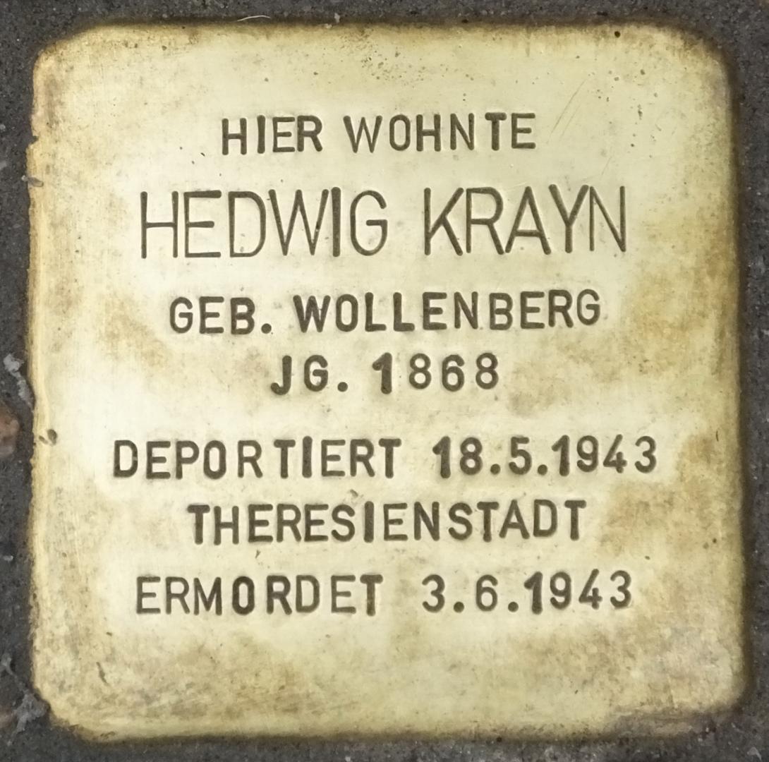 Hedwig Krayn, geb. Wollenberg, geboren am 5. Dezember 1868, stammte aus Thorn (Torun/Polen). Am 31.1.1941 zog sie in den Weinmeisterhornweg 58 zu ihrer Tochter Cäcilie, geboren am 28. März 1892 in Pudewitz (Polen) und ihrem Schwiegersohn, dem jüdischen Kaufmann Leonhard Danziger, geboren am 18. Dezember 1879 in Posen (Poznan).
