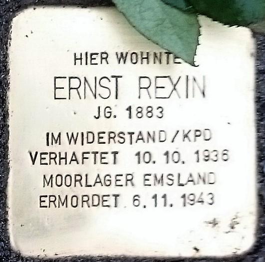Im Berliner Adressbuch ist Ernst Rexin von 1917 bis 1943, zunächst als Schlosser, später als Monteur in der ‚Prinz-Heinrich-Straße 36 Zwg.‘ (Zwischengeschoss) eingetragen.