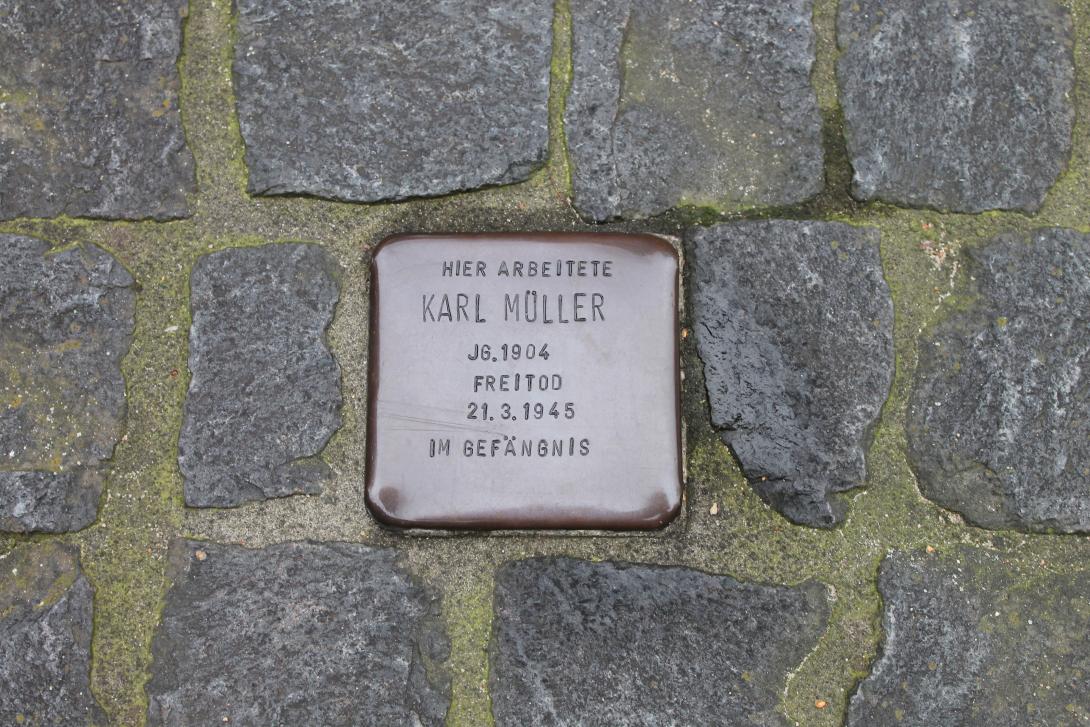 Karl Müller ist vor 1933 Mitglied der KPD und in der Revolutionären Gewerkschafts-Opposition organisiert. Er arbeitet als Schlosser bei General Motors, wird aber wegen seines politischen Engagements entlassen. 1928 heiratet er Gertrude Milletat, aus der Ehe geht ein Sohn hervor. Seit 1935 ist Karl Müller bei der AEG-Turbinenfabrik in der Huttenstraße beschäftigt. Er findet dort Anschluss an eine betriebliche Widerstandsgruppe, die Flugblätter verbreitet und Geld für Angehörige politisch Verfolgter sammelt. Karl Müller stellt außerdem seine Wohnung für illegale Zusammenkünfte und als Anlaufstelle zur Verfügung und hat Kontakte zur Uhrig-Gruppe. Am 24. Februar 1945 wird er festgenommen. Bei den anschließenden Verhören durch die