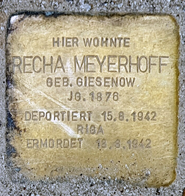 Recha Meyerhoff wurde am 15. August 1942 mit dem 18. Osttransport nach Riga deportiert und dort unmittelbar nach der Ankunft am 18. August ermordet. Ihr Schwager Alfred Stern und ihr Neffe Heinz, mit denen sie bis zu ihrer Deportation zusammengelebt hatte, wurden am 29. November 1942 mit dem 23. Osttransport nach Auschwitz verschleppt und ermordet.