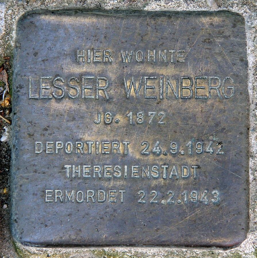 Der Entrechtung folgte die Deportation : Im Spätsommer 1942 erhielten Martha und Lesser Weinberg den Deportationsbescheid. Sie wurden am 24. September 1942 mit dem „66. Alterstransport“ aus Berlin in das Ghetto Theresienstadt deportiert. Der 70-jährige Lesser Weinberg überlebte die katastrophalen Zustände im Ghetto nur wenige Wochen. Der in Theresienstadt ausgefüllte Totenschein gibt den 22. Februar 1943 als Todestag an. Kaum verlässlich ist die notierte Todesursache „Hirnschlag“, da die NS-Ärzte die tatsächlichen Todesursachen mit kaschierenden Sammelbegriffen verschleierten. Martha Weinberg überdauerte fast zwei Jahre die Zustände im Ghetto, bevor die 69-Jährige am 16. August 1944 in Theresienstadt ermordet wurde – entweder durch direkte oder indirekte Gewalteinwirkung mittels planvoller Mangelernährung, versagter Medikamente, Kälte und körperlichen Misshandlungen.