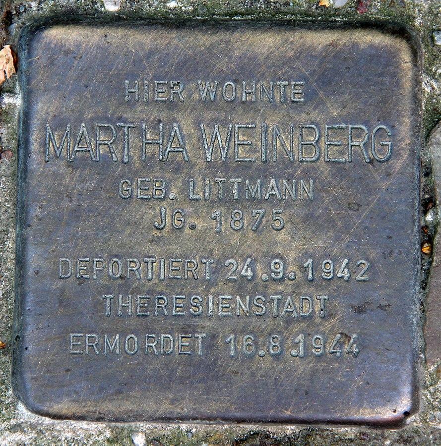 Der Entrechtung folgte die Deportation : Im Spätsommer 1942 erhielten Martha und Lesser Weinberg den Deportationsbescheid. Sie wurden am 24. September 1942 mit dem „66. Alterstransport“ aus Berlin in das Ghetto Theresienstadt deportiert. Der 70-jährige Lesser Weinberg überlebte die katastrophalen Zustände im Ghetto nur wenige Wochen. Der in Theresienstadt ausgefüllte Totenschein gibt den 22. Februar 1943 als Todestag an. Kaum verlässlich ist die notierte Todesursache „Hirnschlag“, da die NS-Ärzte die tatsächlichen Todesursachen mit kaschierenden Sammelbegriffen verschleierten. Martha Weinberg überdauerte fast zwei Jahre die Zustände im Ghetto, bevor die 69-Jährige am 16. August 1944 in Theresienstadt ermordet wurde – entweder durch direkte oder indirekte Gewalteinwirkung mittels planvoller Mangelernährung, versagter Medikamente, Kälte und körperlichen Misshandlungen.