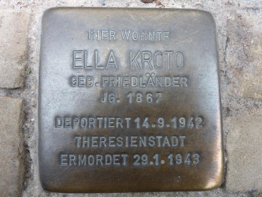 Am 14. September 1942 wurden Valentin und Ella Kroto mit dem Transport I/65, Zug Da 514 in das Ghetto Theresienstadt deportiert. Valentin war 67 Jahre und Ella 75 Jahre alt, als sie zusammen mit den Bewohnern des Altersheims Iranische Straße und des Taubstummen- und Blindenheims Weißensee vom Güterbahnhof Berlin – Moabit aus in das böhmische Ghetto verschleppt wurden.