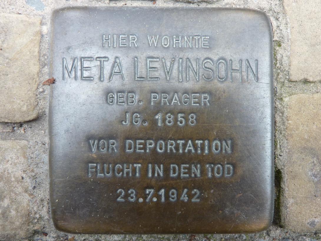 Julius Levinsohn war in Berlin als Landgerichtsrat tätig und wohnte ab 1900 zusammen mit Meta in der Uhlandstraße 31. 1910 starb er im Alter von 60 Jahren an einem Gehirnschlag. Zwei Jahre zuvor war das Ehepaar in die Spichernstraße 16 gezogen. Ob Meta Kinder bekommen hat, ist zwar nicht bekannt, aber wenig wahrscheinlich. Es war ihr Bruder Hermann Prager, der den Sterbefall Julius Levinsohn beim Standesamt meldete. Meta blieb noch einige Jahre in der Spichernstraße wohnen. Sie hatte wohl mit der Pension ihres Mannes ein gutes Auskommen. Ab 1927 finden wir sie im Adressbuch unter Landhausstraße 37 eingetragen. Sie bewohnte eine Wohnung im Gartenhaus. Ihr Bruder Hermann lebte mit seiner Frau Nanny geb. Marasse ganz in ihrer Nähe, in der Trautenaustraße 17. Von ihm wird sie, eine kinderlose Witwe, Unterstützung erfahren haben, besonders als 1938 nach den Novemberpogromen die Diskriminierung der Juden in eine forcierte Verfolgung überging. 1940 nahm Meta ihre jüngere Schwester Jenny Aronson bei sich auf. Diese hatte, ebenfalls verwitwet, Nordhausen in Thüringen verlassen und war ihrer verbliebenen Familie nach Berlin gefolgt.