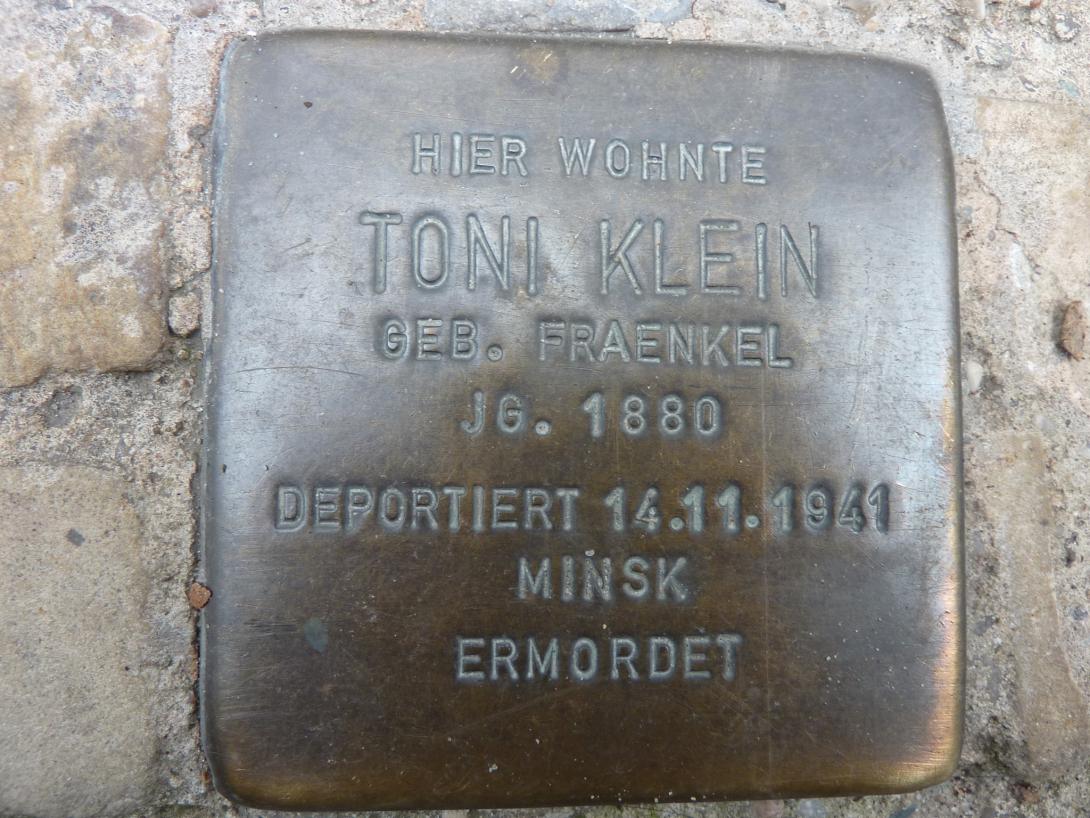 Am 14. November 1941 wurden Toni und Bruno Klein gemeinsam in das etwas 1120 km von Berlin entfernt liegende Ghetto Minsk deportiert. Zuvor waren in dem Ghetto etwa 12000 alte, kranke, nicht arbeitsfähige einheimische Juden erschossen worden, um „Platz zu machen“ für die erwarteten „Reichsjuden“. Etwa 946 Menschen wurden mit dem Zug „Da 54“ von Berlin aus verschleppt. Der Transport wurde auch als „Welle V“ bezeichnet, eine Transportliste existiert nicht.