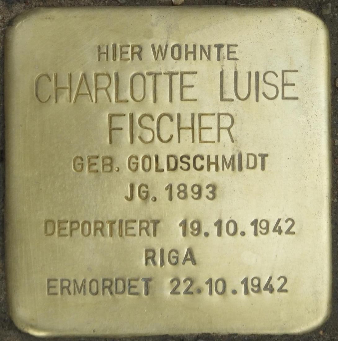 Charlotte Luise Fischer geb. Goldschmidt kam am 24. September 1893 in Berlin zur Welt. Sie war die Tochter von Gertrud Goldschmidt, mit der zusammen sie in der Meerscheidtstraße 13 wohnte. Untermieter war Julius Magnus, der ebenso wie die beiden Frauen ermordet wurde.